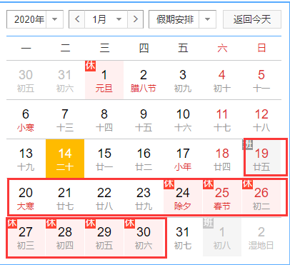 1月19日(星期日)至1月30日(星期四)放假,共12天。1月31日(星期五)上班。
