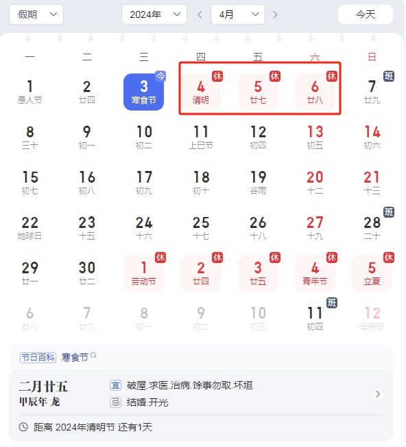 2024年清明節(jié)放假時(shí)間安排: 4月4日(星期四)至4月6日(星期六)放假調(diào)休,共3天。4月7日(星期日)上班。