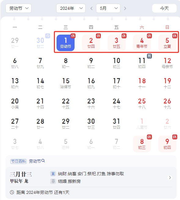 2024年勞動節(jié)放假時間安排: 5月1日(星期三)至5月5日(星期日)放假調休,共5天。5月6日(星期一)上班。