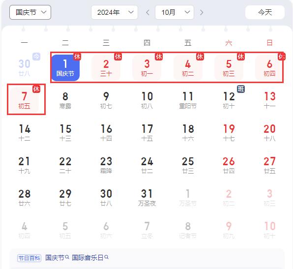 2024年國慶節(jié)放假時間安排: 10月1日(星期二)至10月7日(星期一)放假調(diào)休,共七天。10月8日(星期二)上班。